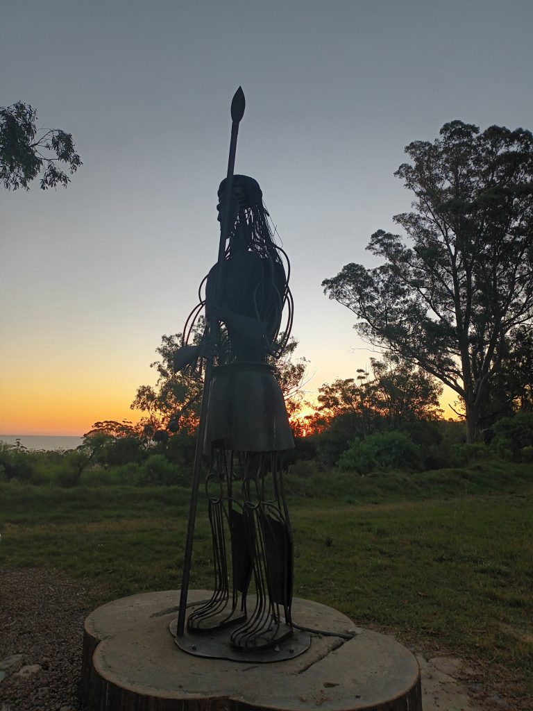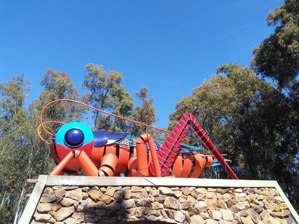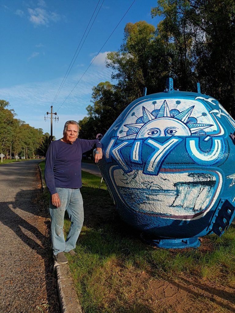 En la entrada de Kiyú por el kilómetro 61, da la bienvenida al balneario: El Grillo, del artista Carlos Reyes, a quien pertenece también la intervención en la Boya del comienzo del Bulevar Uruguay (parada 1).