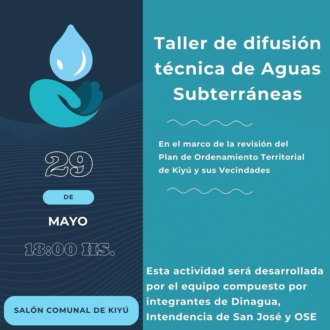 Este 29 de mayo a las 18:00 hs., se realizará un Taller de Difusión Técnica sobre Aguas Subterráneas en el Salón Comunal de Kiyú. La actividad se enmarca en la revisión del Plan de Ordenamiento Territorial de Kiyú y sus Vecindades.